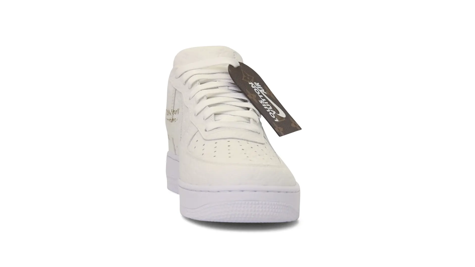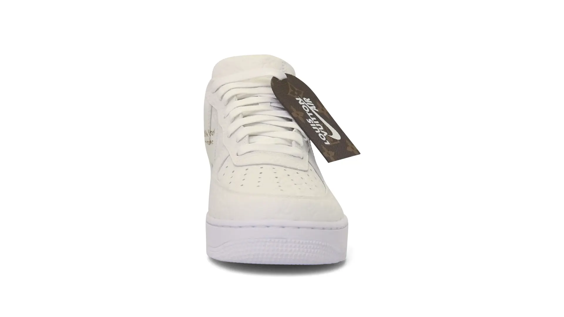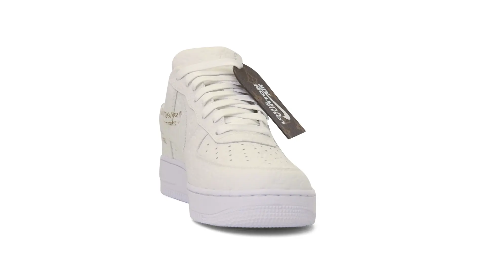 In total, Virgil Abloh designed 47 bespoke pairs of the Nike “Air Force 1” for the Louis Vuitton Spring-Summer 2022 show in collaboration with Nike. To distinguish them from the original Nike Air Force 1, the sneakers were made with materials employed in Abloh’s Louis Vuitton men’s collections and styled with his signature quotation marks, echoing the written graphics Abloh used to adorn the shoes. Every pair was made by Louis Vuitton in Fiesso d’Artico, marking the first time the AF1 model was crafted outside of a Nike factory.