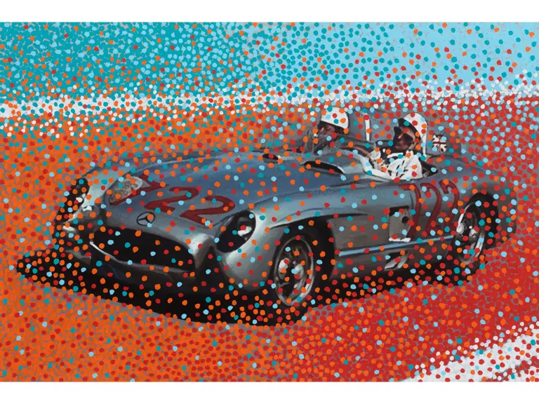 Created especially by Stefan Johansson for the Mille Miglia UAE. Inspired by Stirling Moss and Denis Jenkinson’s victory at the 1955 Mille Miglia in their Mercedes-Benz 300 SLR. Measures 101.5 x 52 cm, acrylic on canvas.