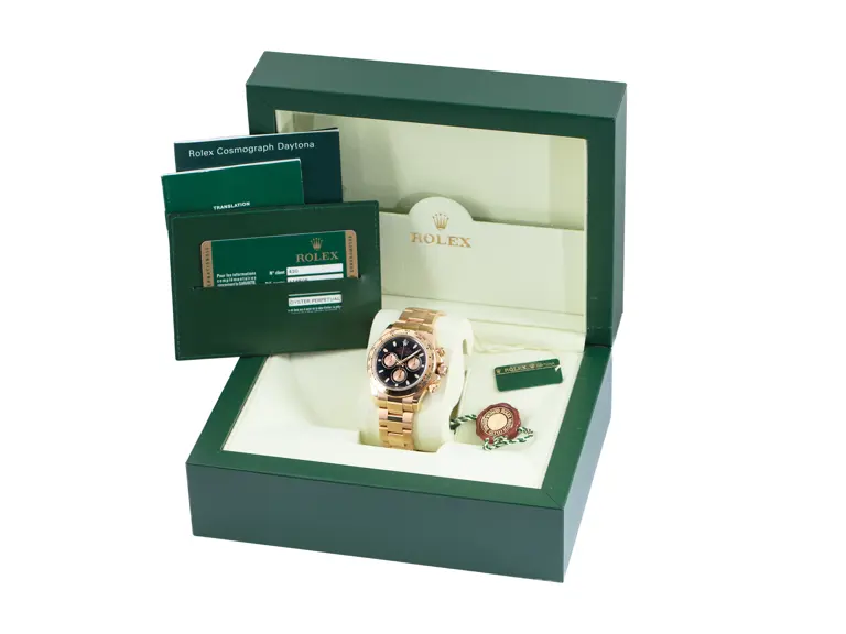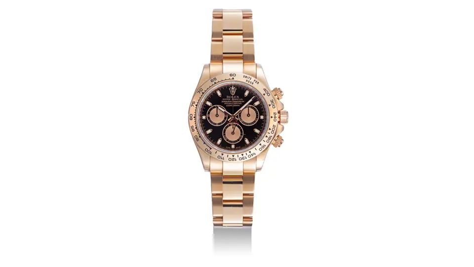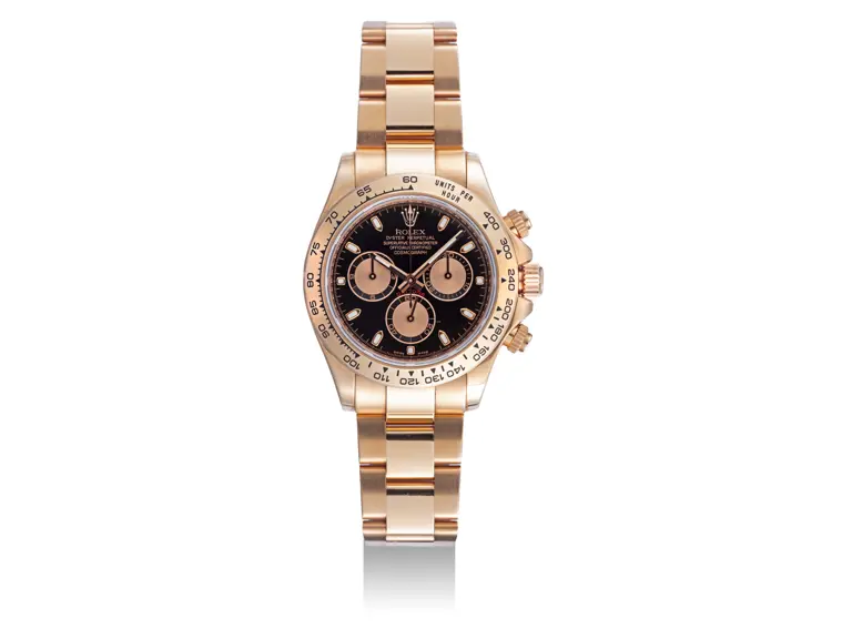 First launched in 1963, the Rolex Cosmograph Daytona was designed to cater to professional racing drivers, establishing a legacy that has become synonymous with the brand itself. Over the decades, the Daytona family has evolved, adopting various styles and materials that reflect Rolex's experimental approach to the classic chronograph. The present example, produced circa 2008, features the in-house calibre 4130 chronograph movement and an 18k Everose gold case and bracelet in contrasting finishes, complemented by a black dial with pink gold subsidiary dials, offering an elegant blend of innovation and timeless appeal.