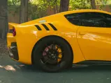 Although the interior is predominantly trimmed in Nero Alcantara, this is complemented by Charcoal Alcantara for the inner sections of the large-size carbon fibre racing seats equipped with four-point harnesses. Similarly, the headliner, lower dashboard, parcel shelf, and centre console have all been configured in Charcoal. To tie in with the exterior, the famous Cavallino stitched into the headrests and the rev counter are presented in yellow, while details such as the fascia inserts have been finished in carbon fibre.
