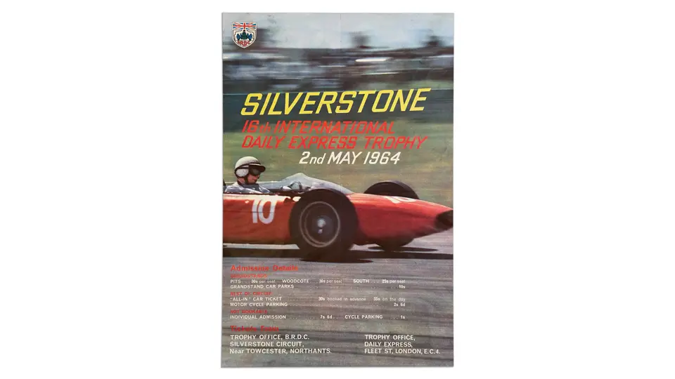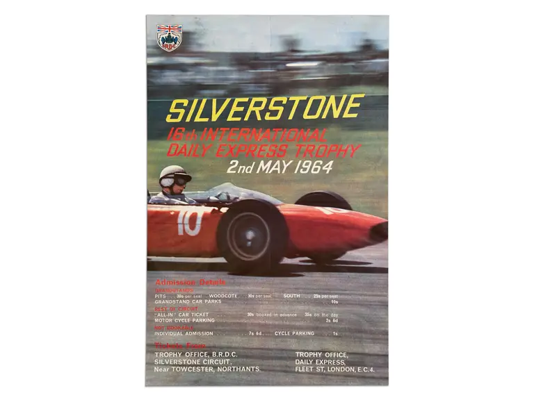 Extremely rare oversized poster for the the Formula One race at Silverstone in 1964. The poster features photography of World Champion John Surtees in the Ferrari Formula One race car. John Surtees is the only champion to win world champion titles on both cars and bikes. The 1960s Silverstone International Trophy posters incorporate some of the best art and design of posters from this era.