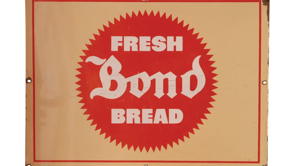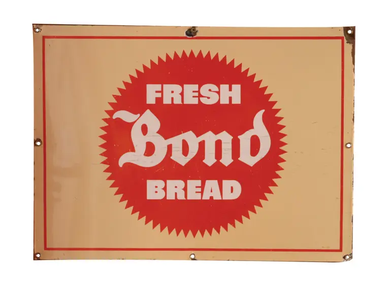 Fresh Bond Bread Surface is glossy and clear. Colors are good, but there is extensive surface scuffing across image area. Select mounting holes show minor chipping, as do two corners. Sides: Single-sided Authenticity: Original Material Type: Porcelain Mounting Style: Wall Size: 19X14 RM Grade: 6+ Shipping Class: 2F ----------------------- Ward's Tip-Top Bread Colors are bright. Close inspection reveals spotting and discoloration of surface. Edges and mounting holes show minor chipping and deterioration. Sides: Single-sided Authenticity: Original Material Type: Pressboard Mounting Style: Wall Size: 24X26 RM Grade: 7 Shipping Class: 3F -----------------------