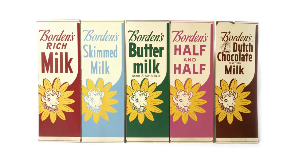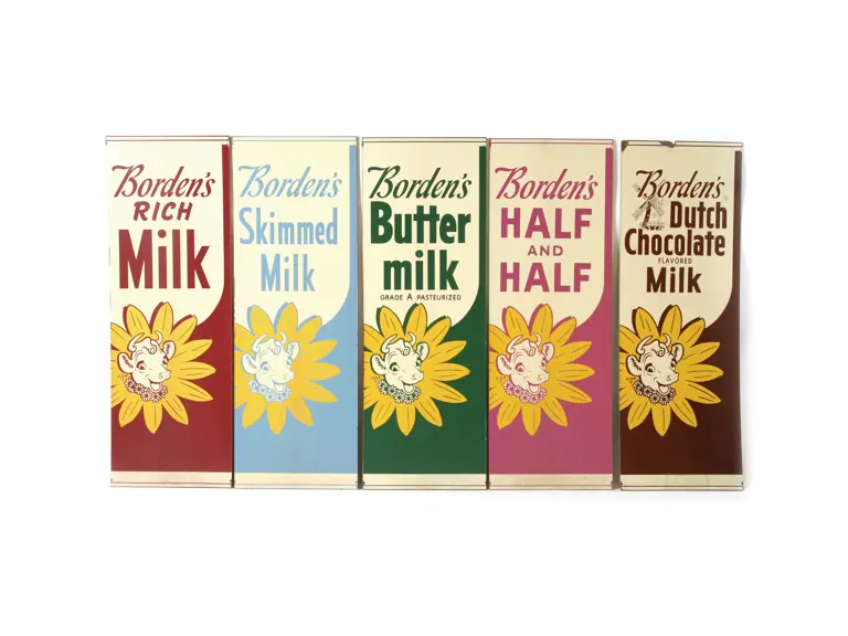 See 2082 (sold together as a set) Bright, attractive colors, and nice graphics. One sign of the group has a small gouge at the top edge. Overall, this set presents very well. Sides: Single-sided Authenticity: Original Material Type: Pressboard Size: 16X46 RM Grade: 8 Shipping Class: 5F ----------------------- Set of Borden's Milk Signs Rare, desirable signs, particularly hard to find as a set. Bright, attractive colors, and nice graphics. One sign of the group has a small gouge at the top edge. Overall, this set presents very well. Sides: Single-sided Authenticity: Original Material Type: Pressboard Mounting Style: Wall Size: 16X46 RM Grade: 8 Shipping Class: 5F -----------------------