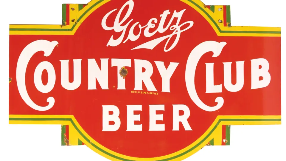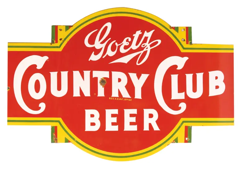 Die-cut example from Missouri features attractive colors. Finish is glossy; colors have mellowed somewhat. Surface is largely free of flaws save one notable chip in center. Mounting holes show wear. Edges are clean. Sides: Double-sided Authenticity: Original Material Type: Porcelain Mounting Style: Hanging Size: 48X32 RM Grade: 6+ Shipping Class: 5F -----------------------