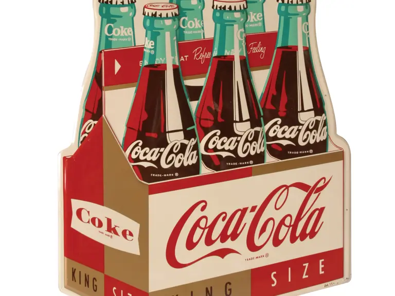 Features a king size six pack, first introduced in 1955. A gorgeous, highly desirable example. Excellent condition. Colors, finish are bright and shiny. Wonderful image of the six pack is free of even the slightest flaw. Mounting holes show little to no wear. Bottom right corner shows a small area of paint loss and wrinkling. Sides: Single-sided Authenticity: Original Material Type: Embossed Tin Mounting Style: Wall Size: 30X36 Special Features: Raised Lettering Manufacturer: AM RM Grade: 9 Shipping Class: 4F -----------------------