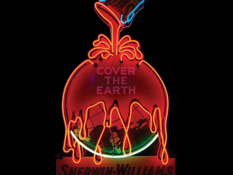 Neon may have been added later. Colors are slightly faded. Surface shows several areas of inpainting to disguise flaws. Extensive inpainting is visible at perimeter, crazing is present at mouth of paint can. Sides: Single-sided Authenticity: Original Material Type: Porcelain Mounting Style: Wall Size: 72X36 # of Colors: 3 Colors: Blue, Red, Green RM Grade: 6 Shipping Class: 9N -----------------------