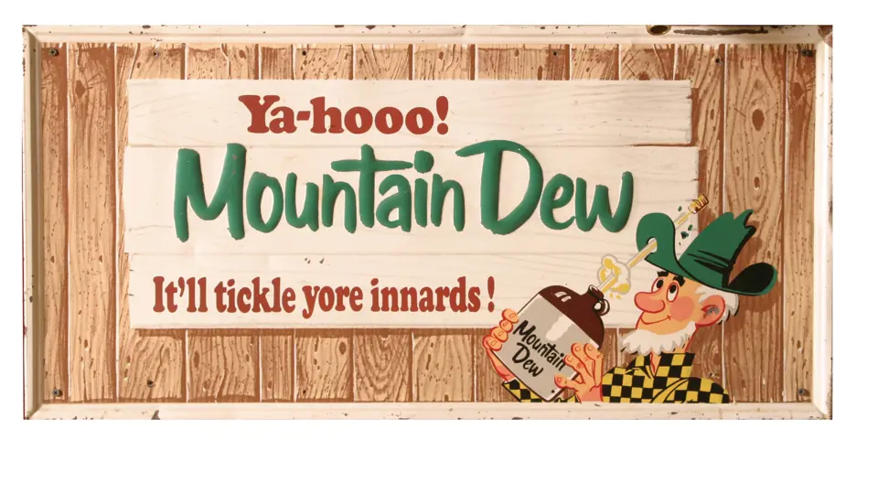 One of the most highly sought after signs from the period. Surface is generally free of flaws save minor scratching and paint loss. Whimsical hillbilly graphic presents well. Edges show further scratching and paint loss, particularly on raised border. Sides: Single-sided Authenticity: Original Material Type: Embossed Tin Mounting Style: Wall Size: 35X17 Special Features: Raised Lettering Manufacturer: Stout Sign Co. RM Grade: 7 Shipping Class: 4F -----------------------