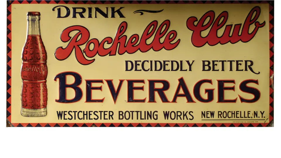 Rochelle Club Beverages Hard to find piece with very nice period graphics. Bottle graphic and lettering shows very well. Paint shows some patina, but surface is generally clear of imperfections save some minor surface scuffing. Corners and mounting holes show some wear, paint loss, and rust. Sides: Single-sided Authenticity: Original Material Type: Embossed Tin Mounting Style: Wall Size: 24X12 Special Features: Raised Lettering Manufacturer: The Novelty Adv. Co. RM Grade: 7+ Shipping Class: 3F ----------------------- Five-O Chocolate Flavor Attractive example with a clear image area and compelling colors. Surface shows some minor scuffing on embossed areas, and extremely minor spotting due to paint loss. Mounting holes show wear and corners are somewhat wrinkled. Sides: Single-sided Authenticity: Original Material Type: Embossed Tin Mounting Style: Wall Size: 23X11 Special Features: Raised Lettering Manufacturer: W.F.R. RM Grade: 7 Shipping Class: 3F -----------------------