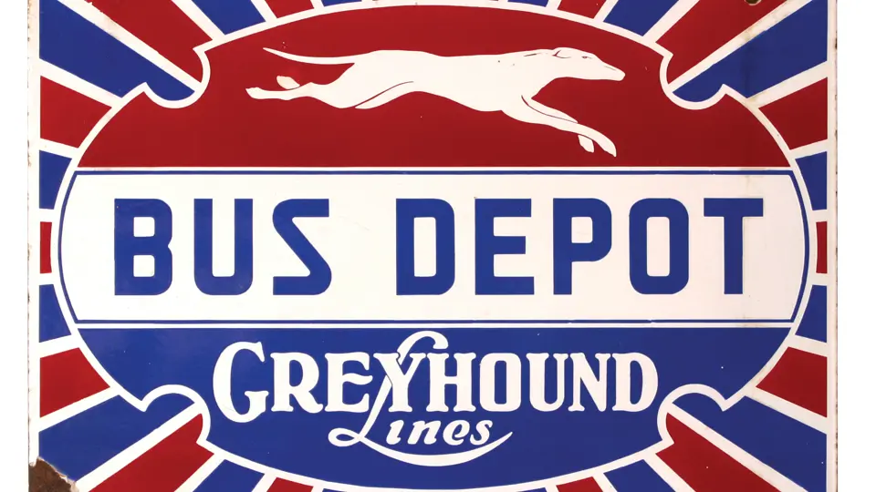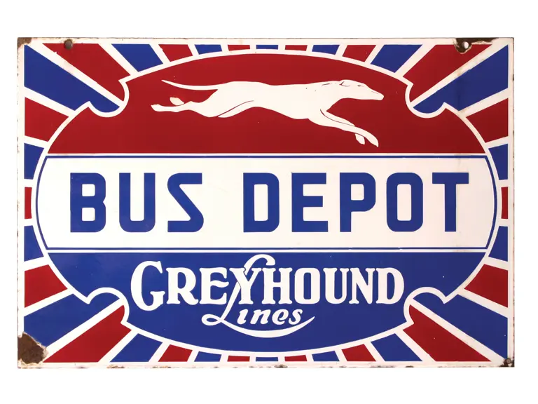 Beautiful, highly sought after example. Features red and blue stripes that flare outward and a running greyhound graphic. Colors are vibrant; finish is glossy. Image area is largely free of flaws and presents very well. Surface shows minor scuffing, but no notable chips. Chipping is present at perimeter, at mounting holes and corners. Sides: Single-sided Authenticity: Original Material Type: Porcelain Mounting Style: Wall Size: 30X20 RM Grade: 7 Shipping Class: 4F -----------------------