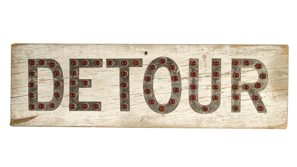Unique, period highway sign. Surface has weathered considerably due to outdoor exposure, but has acquired an attractive patina. All jewels are intact. Sides: Single-sided Authenticity: Original Material Type: Wood Mounting Style: Wall Size: 31X9 Special Features: Jeweled RM Grade: 6 Shipping Class: 4F -----------------------