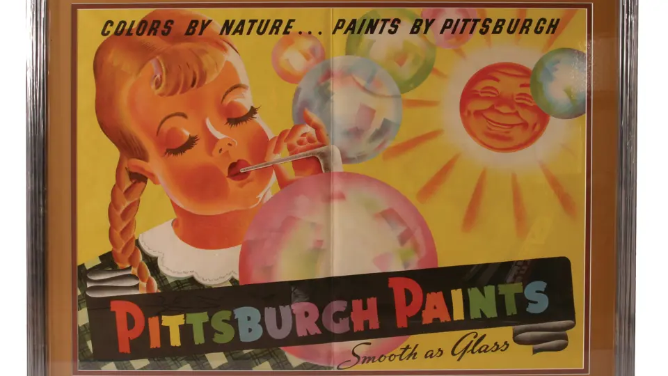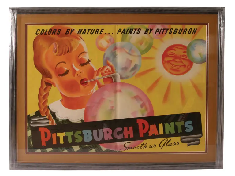 Beautiful vintage poster for Pittsburgh Paints featuring delightful image of a little girl blowing brilliant, iridescent soap bubbles. Colors are spectacular. Paper surface is generally smooth with minor wrinkling near center fold line. Child's hand shows tiny mark. Minor tear at right hand side, visible only upon close inspection. Attractively framed and matted. Sides: Single-sided Authenticity: Original Material Type: Paper Mounting Style: Wall Size: 52X42 RM Grade: 8+ Shipping Class: 6F -----------------------