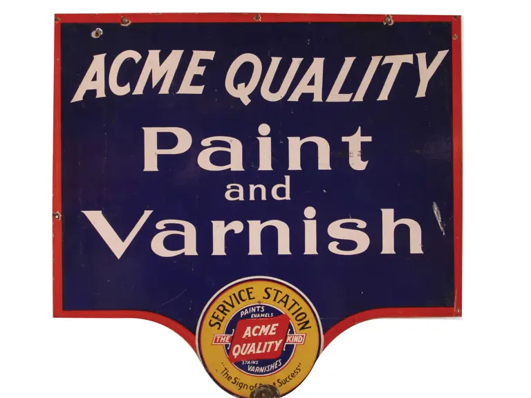 Surface shows some overall scuffing; bottom edge has puncture surrounded by large chip. Edges are generally intact with little wear. Mounting holes show wear, with minor chipping surrounding. Sides: Double-sided Authenticity: Original Material Type: Porcelain Mounting Style: Hanging Size: 27X26 RM Grade: 6+ Shipping Class: 3F -----------------------