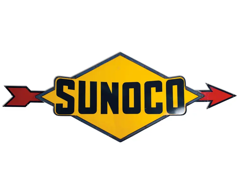 Beautiful example in classic Sunoco colors; outlined in neon. Surface presents well. Image area contains a few minor blemishes. Perimeter shows chipping and rusting throughout. RM Grade: 6+