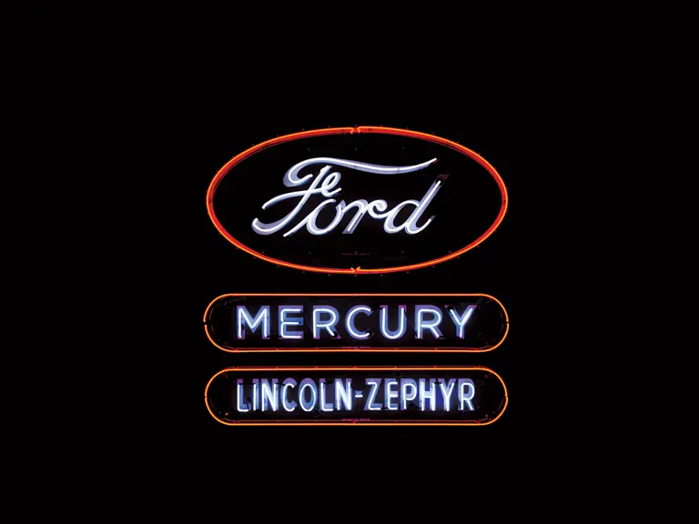 Outstanding example of a classic Ford dealership sign promoting the corporations multiple marques. Restoration has returned this sign to as new condition. A striking die-cut for the discriminating collector. Fantastic finish with bright colors and excellent gloss. Paint and neon are in excellent condition. All around a superior example. RM Grade: 9
