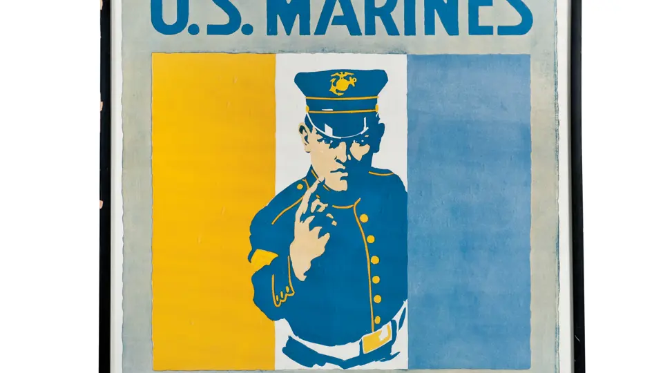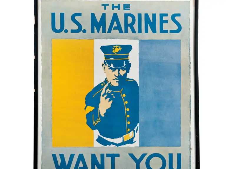 "The U.S. Marines want you. Apply at..." In good condition; tape marks along edges. The frame also has chipping.