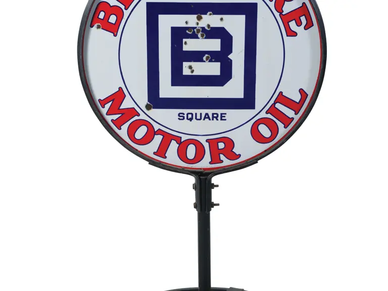 Although in great shape, sign has numerous paint chips in image area that detract from an otherwise excellent presentation. Pedestal has fresh paint and is solid. RM Grade: 5+