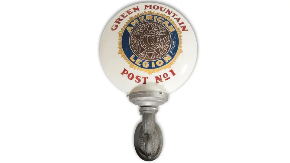 Green Mounting Post No. 1, the American Legion, gas globe. Graphic shows minor scratches and fading throughout. RM Grade: 6+
