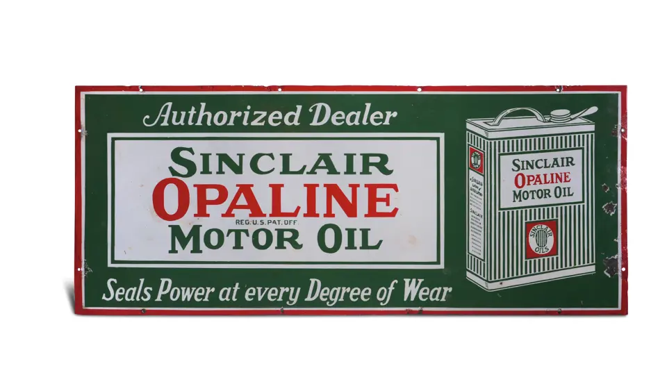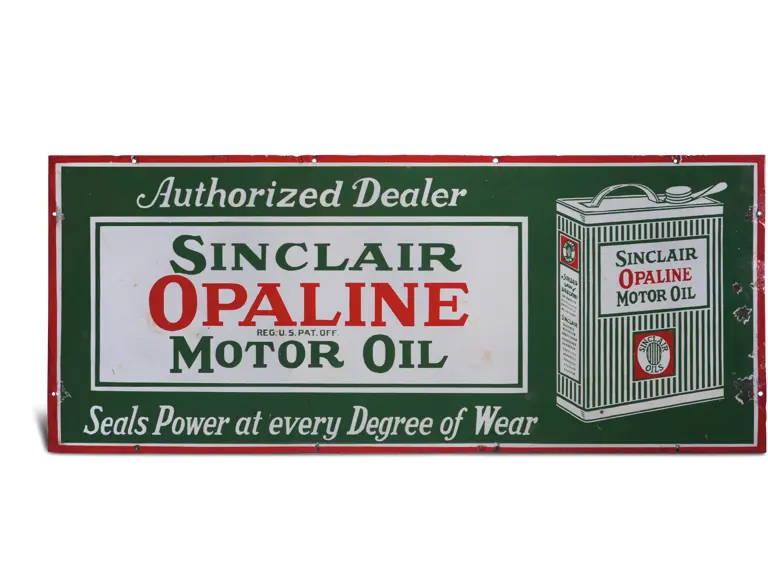 Presented in classic Sinclair colors; promoting "Sinclair Opaline Motor Oil: Seals Power at every Degree of Wear." Lovely patina; image area presents very nicely and is largely free of flaws. Border and edges contain chipping. RM Grade: 7