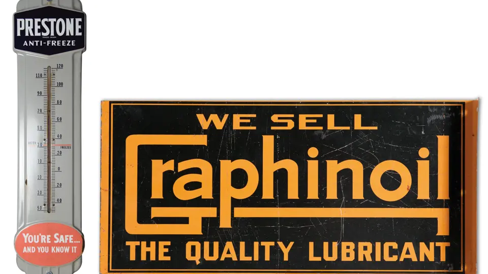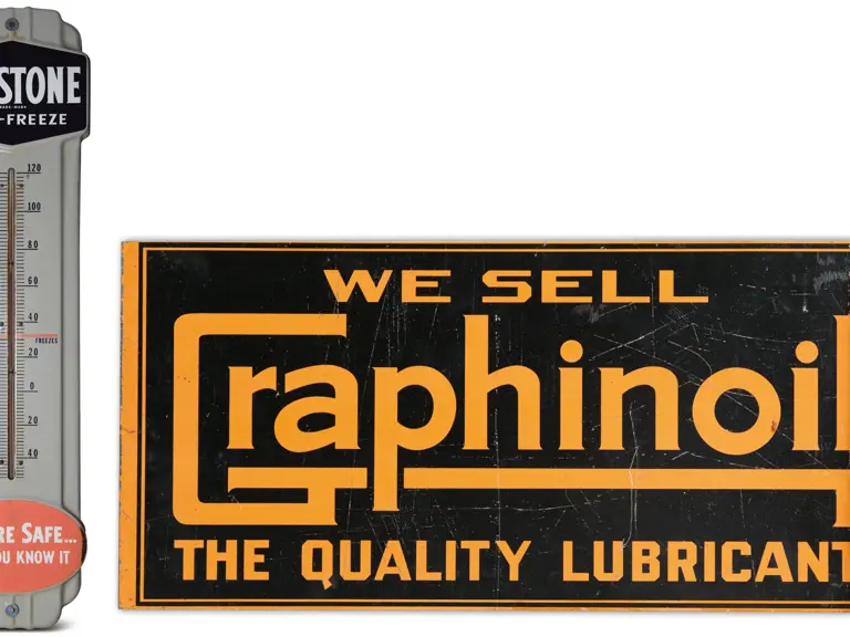 Glossy finish and colors are mainly bright. Some light discoloration around mounting holes and near bottom of thermometer. Minor edge chipping and rusting, and a couple of small chips in the graphic area. RM Grade: 6+