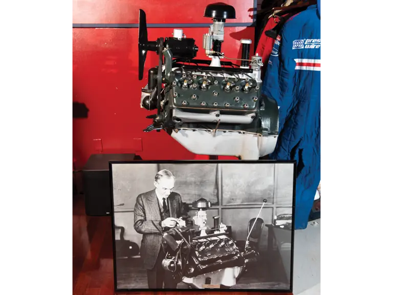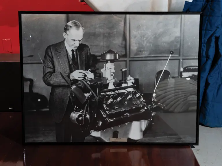 Very early 221-cu. in. 21-stud V-8 engine, complete with cast iron cylinder heads, aluminum intake manifold, distributor, coil, generator, fan, carburetor, fuel pump and water pumps, but no clutch. The engine is mounted on a three-wheel dolly by Western Tool Company of Greenfield, Ohio. The engine appears identical to that in a well-known photo of Henry and Edsel Ford examining the new V-8, a framed print of which is included.