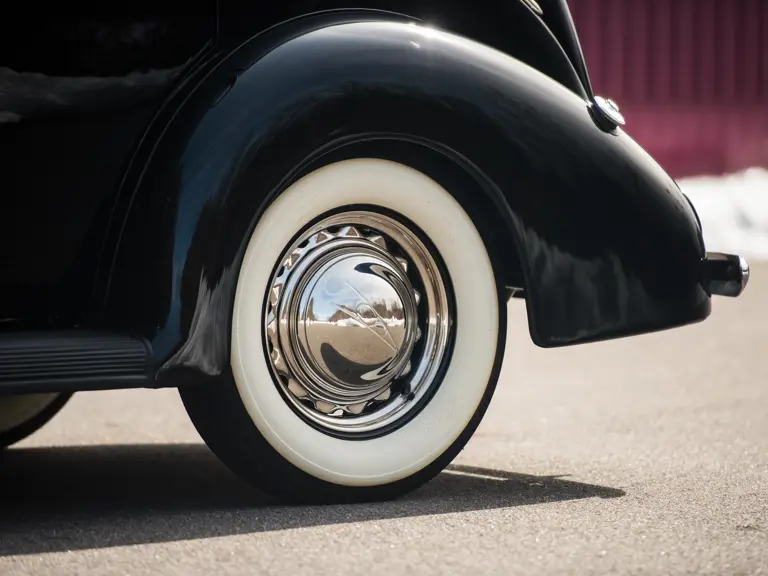 The engine compartment is correctly detailed, using all period hardware. The undercarriage is exceedingly clean and properly detailed. The wheels, fitted with Ford-script 6.00 × 16 double whitewall tires, are accented with spider hubcaps and trim rings. Like all cars in the Dingman Collection, it has been maintained in exceptional condition.