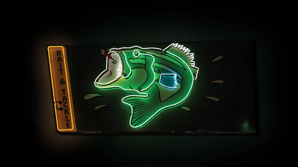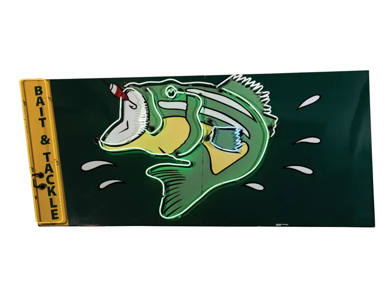 Two-piece porcelain sign with rolled edges. Originally neon, as presented. "Bait & Tackle" vinyl added.