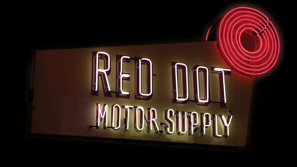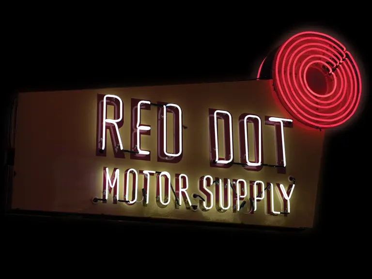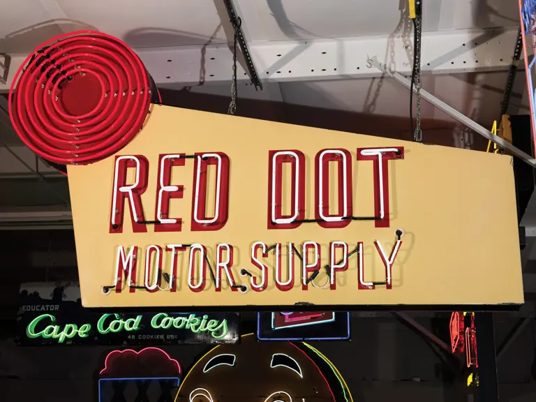 Porcelain sign with rolled edges and aluminum tubed frame. Originally neon, as presented, with flashing feature added.