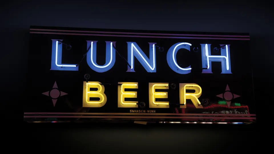 Original porcelain sign, repainted to repair considerable damage. Originally neon, as presented.