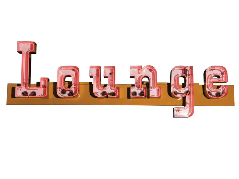 Recessed lettering with enclosed neon. Restored with polished stainless and repainted lettering.
