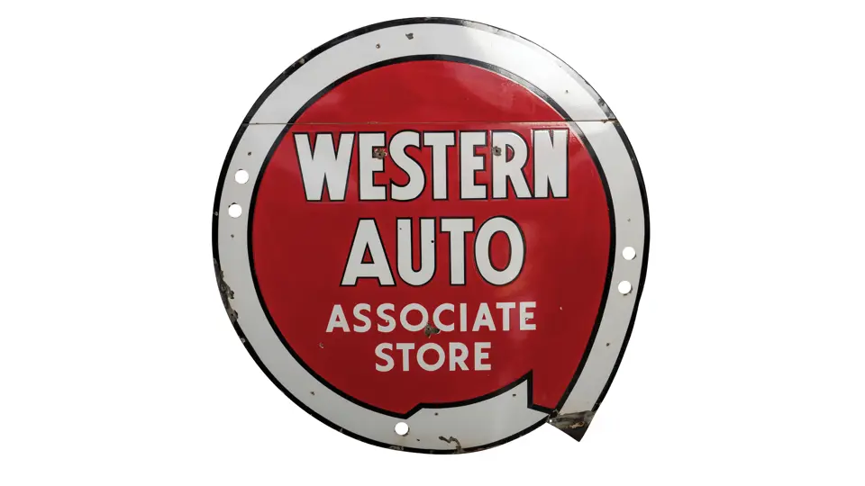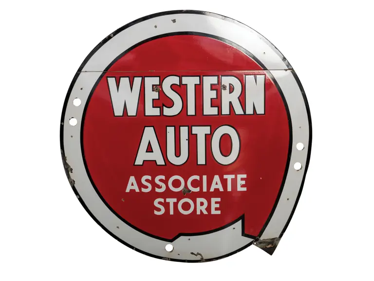Porcelain sign. Restoration candidate, missing the arrow portion. Originally neon.