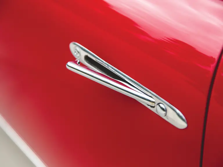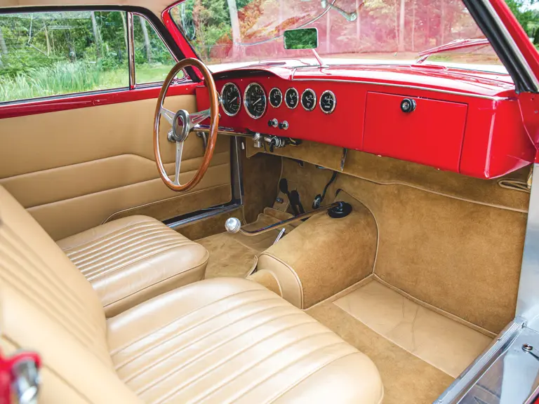 The distinctively handsome Vignale-bodied coupe shown here, chassis number 000047, was originally exported to Turin on 11 June 1953 finished in verde. The design is distinguished by its flared rear fenders, forming finned flying buttresses on either side of the decklid and inset rear window; a distinctive oval radiator opening flanked by chrome “bumperettes” (echoed in the rear) and carrying a simple egg-crate insert; and delicate chrome trim around the doorsills and windows. Features of the car, including the round headlights and the design of the front fenders, are echoed in other Vignale designs of the period, including OSCAs and Ferrari 375 Americas. Low windows and a high beltline exaggerate the power and personality of the lines. The interior is understated, yet elegant, with pleated leather bucket seats facing a dashboard with a full complement of simple round Veglia gauges.