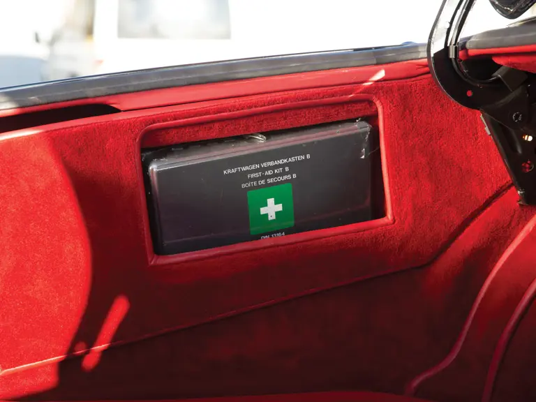 Previously registered to an individual in Bern, this example is beautifully outfitted in black paint over a red leather interior. Inside, a plaque reading ‘Autosattlerei Wenger, Exklusive Interieur’ can be found, suggesting that at some point after leaving Alpina, the interior was retrimmed in its present, voluptuous red leather and fitted with sport seats. Riding on Alpina multispoke wheels, it is accompanied by a complete trunk-mounted tool kit and first aid kit. Furthermore, it has been upgraded with a Sony CDX-J10 CD player with a trunk-mounted disc changer.