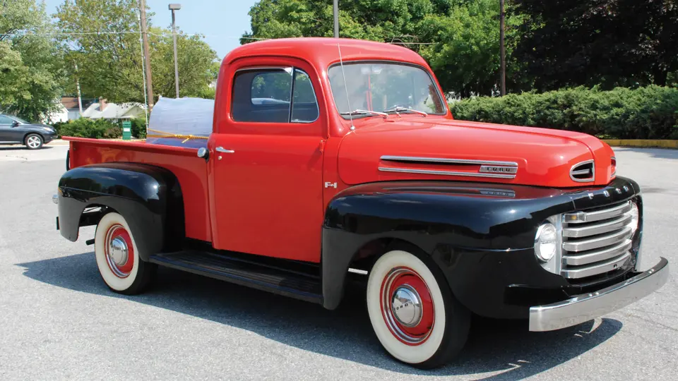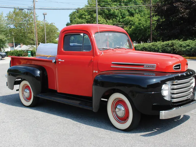 Beautifully restored truck finished in red and black two-tone paint, with red wheels and white walls.
