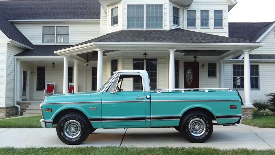 This classic pickup is finished in turquoise and white with green houndstooth interior. It has a small block 350-cid V-8 engine with a turbo 400 column shift automatic transmission. It has power steering and brakes, a wooden steering wheel and tilt column, original AM radio, and a hidden radio with remote control. It has its original manual and build sheet. Owner reports that its bed is in excellent condition without any dents, has no rust, nice glass and chrome, and Michelin tires.