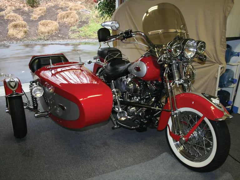 Over $40,000 has been invested in this machine that has been utilized sparingly by the owner and his wife for motorcycle events and parades. The red and silver paint complement the style of the bike and looks fantastic. Options and features seen on this Harley-Davidson include alarm system, dual spotlights, custom seats, mirrors and exhaust system, AFI horn, front and rear disc brakes, windshield along with many chrome extras. The companion sidecar has a windshield, snap-on tonneau cover, locking storage compartment, fold down step for access, coil shock, headlight and brake lights.