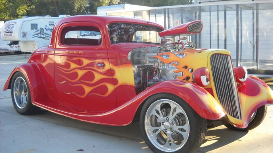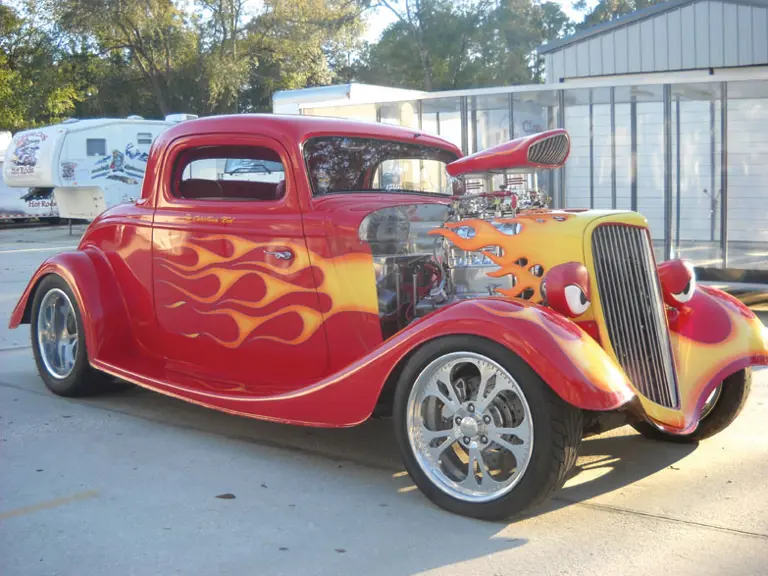 "The Carolina Kid" is a 1934 Ford Fiberglass 3 window Pro-Street coupe built by Cripple Dog Hot Rods in Charleston, S.C. It has a custom flamed paint job, real alligator skin & Leather interior with matching trunk, Custom made Bonspeed wheels with "Flame Tread Mickey Thompson tires. The 350 Chevy Motor is all Chrome & stainless with an 851 Weiand Blower and twin Weber Chromed Carbs, automatic transmission, AM/FM/CD player and stainless disc brakes. This engine is topped with a 60's style pro-street fiberglass air intake that is painted to match the car. It is a multiple Best in Show & Best in Class winner. The Kid is not only a head turner but is also very "Driveable." Over $100,000 invested!