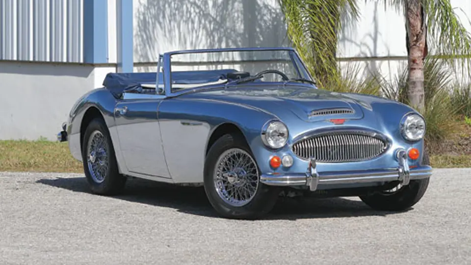 Looking period-appropriate in a sharp two-tone blue and white exterior with a complementary blue interior and convertible top; this Austin-Healy runs with a 2,912-cc,150-hp inline six-cylinder engine that is mated to a four-speed manual transmission with overdrive. The car carries an older restoration that runs and drives excellent and also has new chrome wire wheels and blackwall tires.