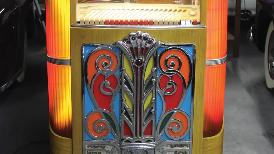This beautiful jukebox appears in all original condition with a nice antique patina, and with a red and white Line-o-select program selector for your music choices. It features a composite front, rainbow light-up motif that combines an array of color and animation, chrome plated bright work in a decorative pattern with colorful inserts throughout. 78 RPM record mechanism and comes complete with records.