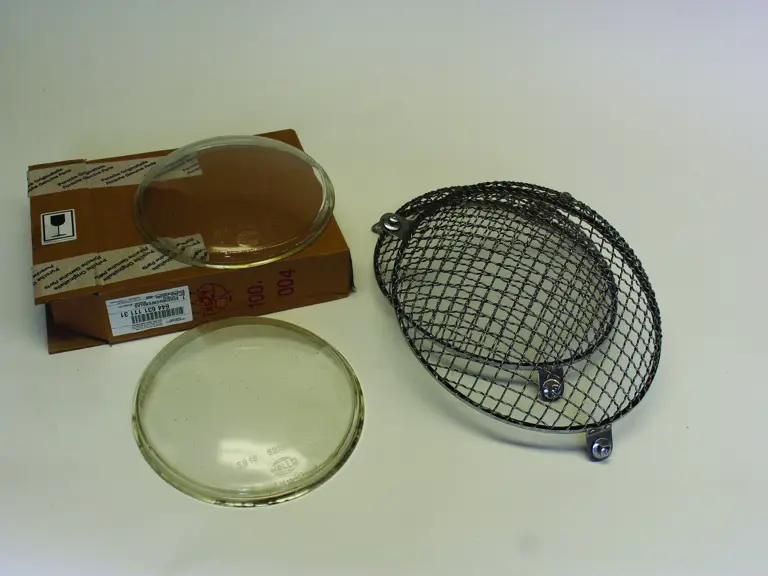 A pair of Hella headlight lenses together with a pair headlight stone guards.