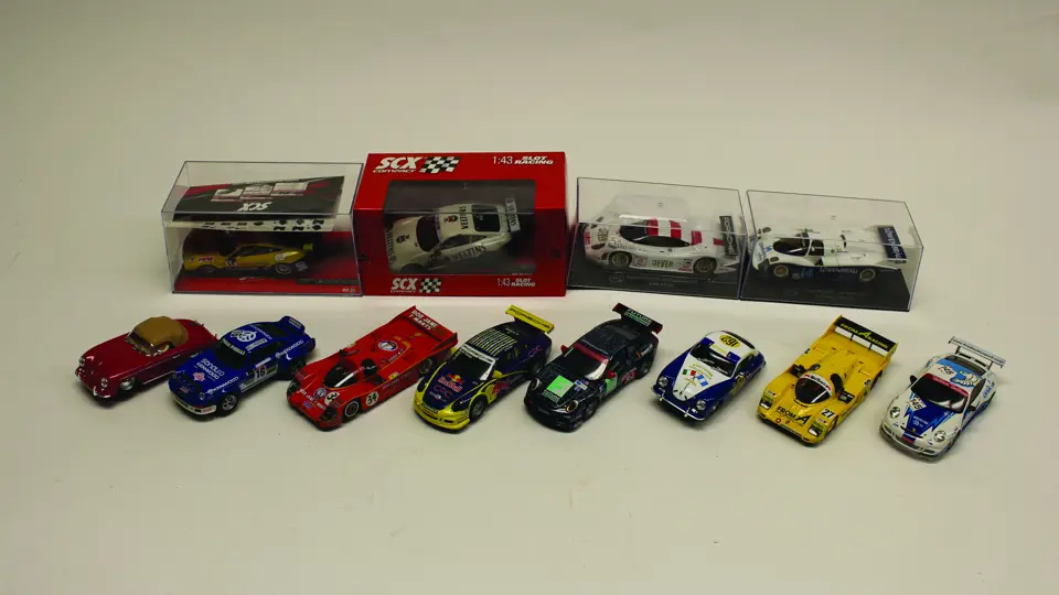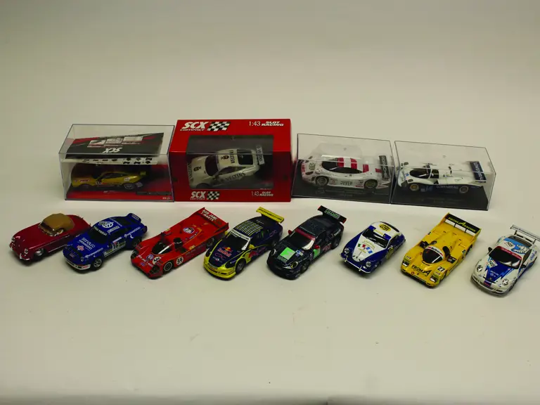 An assortment of 12, 1/32, Porsche slot cars.