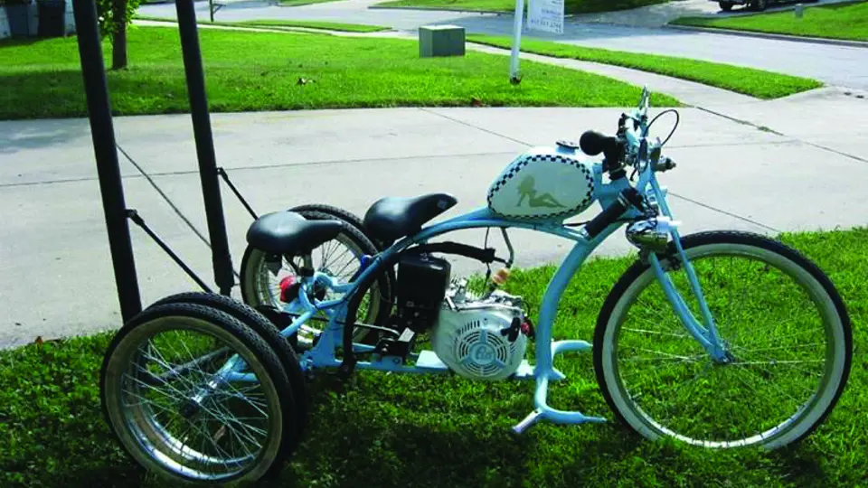 Old-school, gas-powered, motorized, custom trike.