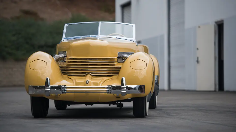 When the "new Cord" made its debut at the New York Auto Show in November 1935, it turned the automotive world on its ear. Onlookers reportedly stood on the roofs of other cars just to catch a glimpse of Gordon Buehrig's stunningly advanced "new, original, and ornamental design for an automobile," with its aerodynamic "coffin nose" louvered hood lacking a traditional radiator shell; its "step-down" floor; its unitary body construction; its hidden door hinges; its pop-up headlamps; and its total lack of running boards.