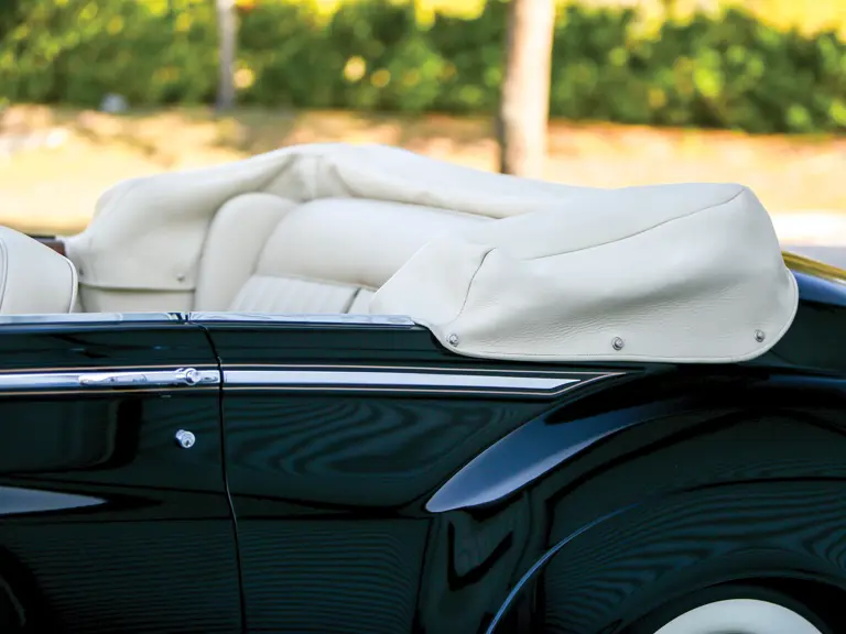 The factory H.J. Mulliner Drophead Coupe offered here underwent an extensive frame-off restoration to concours standards utilizing a 40-year collection of NOS Rolls-Royce and Mulliner components. At this time, it was also being converted to U.S.-specified left-hand drive. The careful use of chrome accents against the gleaming midnight black exterior and the contrasting white interior and burlwood dash give the car an opulent presence that few could match. This, in combination with the car’s rarity, combined to help it achieve a 1st in Class award at the Dana Point Concours d’Elegance. With classic whitewall tires perfectly complementing the interior and matching white convertible top boot cover, the car retains its elegant look accentuated by smoothed, swept-back body lines, and rounding rear fenders.