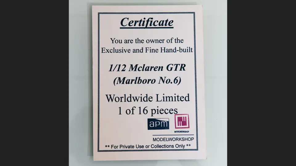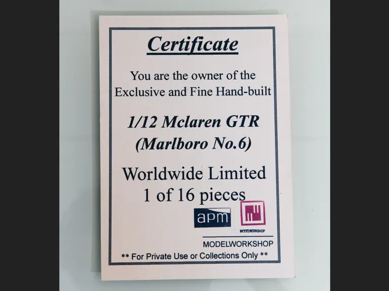 This 1:12 scale model features the unique livery of the #6 F1 GTR as raced by J.J. Lehto, Ray Bellm, and James Weaver at Zhuhai 4 Hours on 3 November 1996. It was the last race 12R competed in and the only time it bore this livery. This model is one of only 16 produced by APM Model Workshop. Includes acrylic display case and certificate of authenticity.