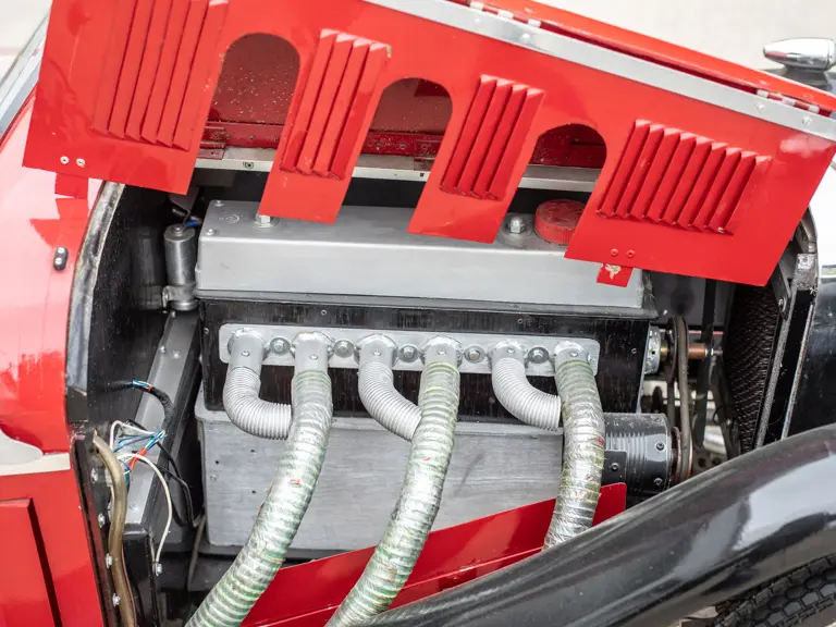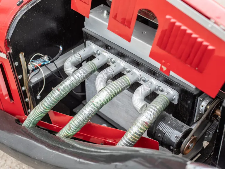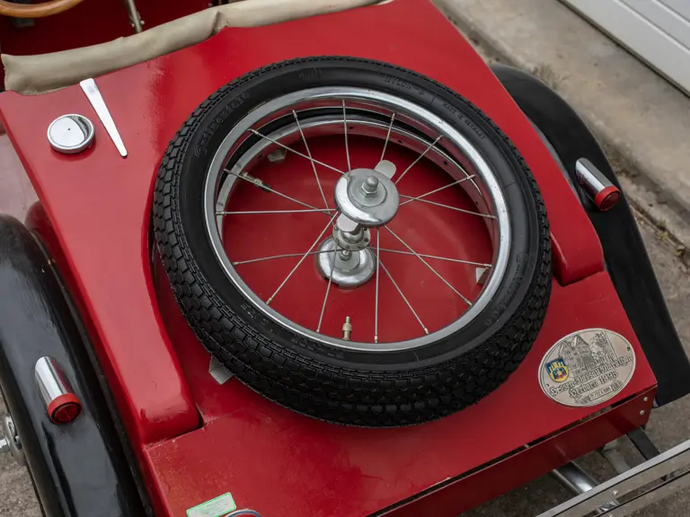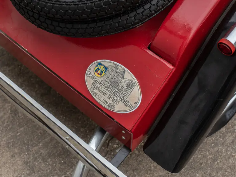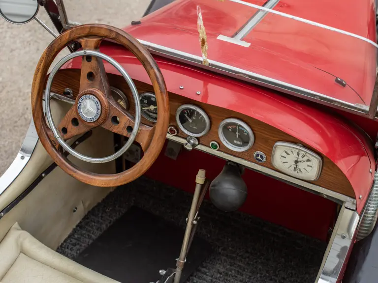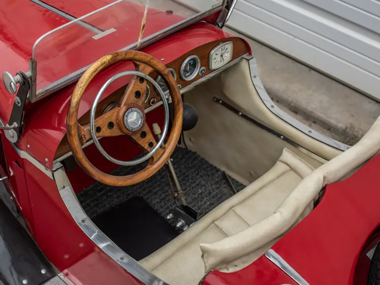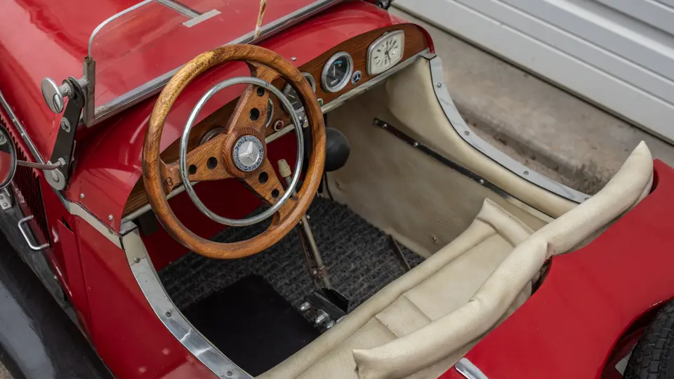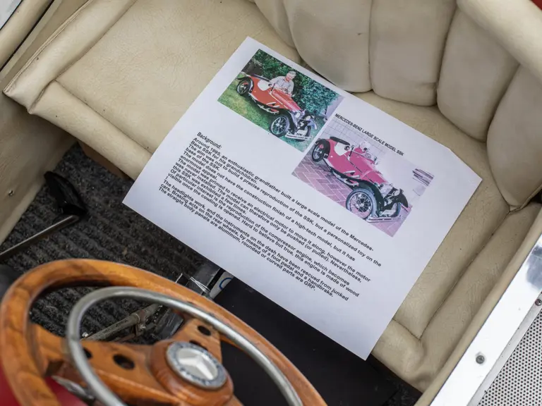 The model was built to receive an electric motor; however, the motor was never installed. Of particular interest, is the reproduction compressor engine made entirely of wood. The headlights work and the instruments on the dash were rescued from local junkyards. Rear brakes can be activated with a foot pedal and handbrake. Unlike most pedal cars, this floor is closed and carpeted. This SSK has lao been exhibited several times by its original builder.