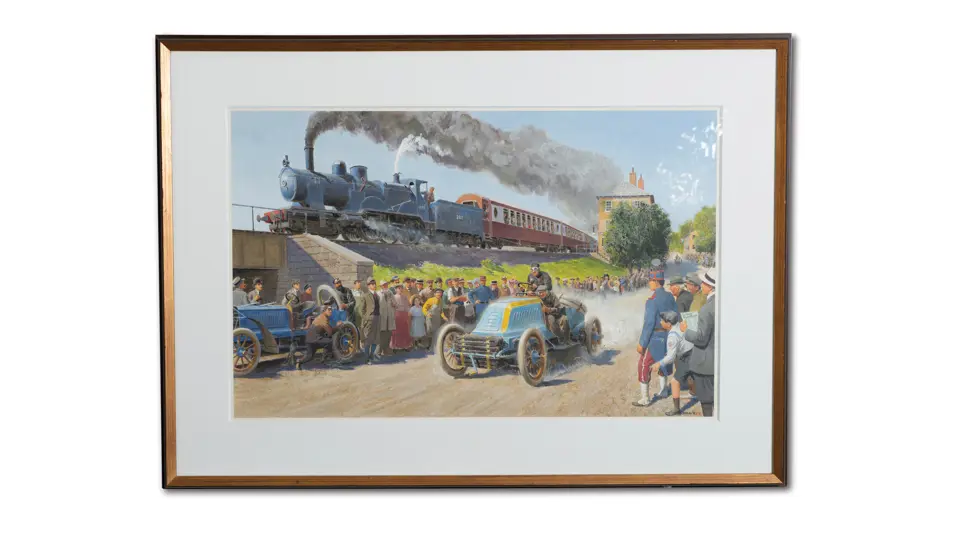 Exciting scene depicting De Cater's Mors sprinting through a crowd with train in the background.
