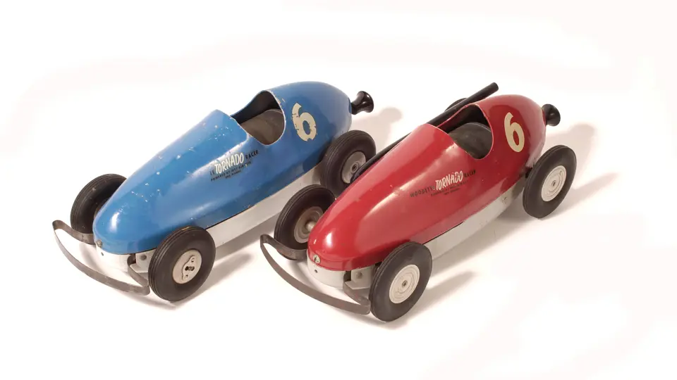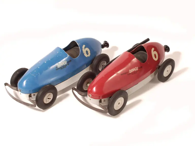 These 1950s aluminium bodied, air powered Indianapolis-style racing cars were produced by the Winzeler Mfg. & Tool Co. of Chicago. The two-piece body section has a hand operated, rear-mounted pump which powers up a front wheel drive facility. Both are in presentable condition; the blue example shows slightly more wear than the red one, and is missing its exhaust.