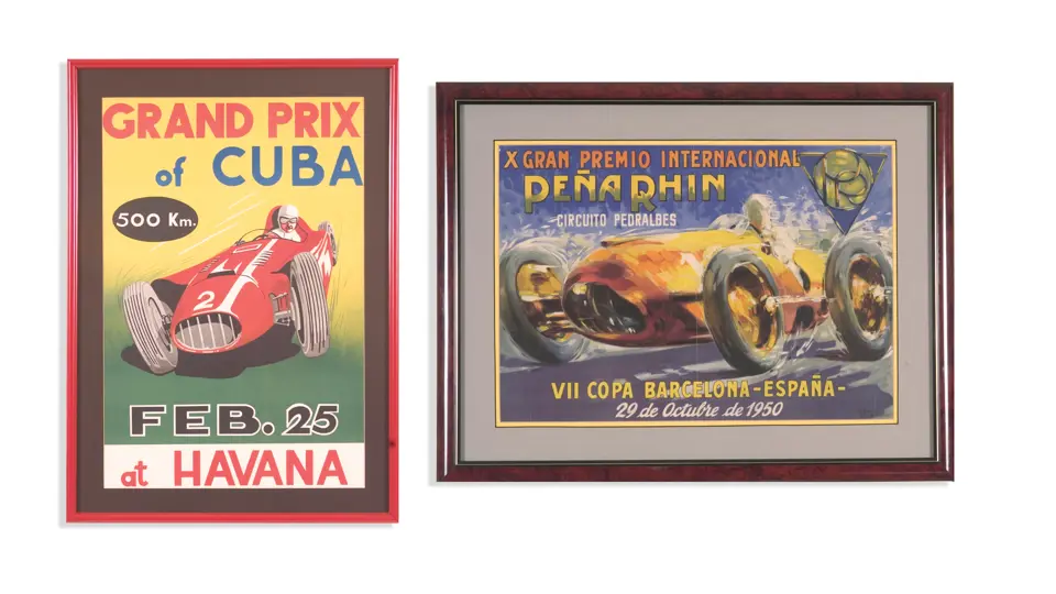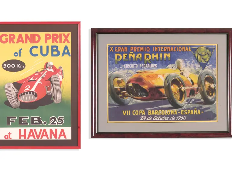 23x18 inches, 24x33 inches. Offered here is a rare, dynamic Spanish language poster that advertises the Gran Premio de la Pe�a Rhin with a beautifully colored illustration. Also included is a wonderful period image celebrating the Grand Prix of Cuba. Beautiful colors and the speeding race car contribute to this poster's eye appeal. In virtually mint condition.