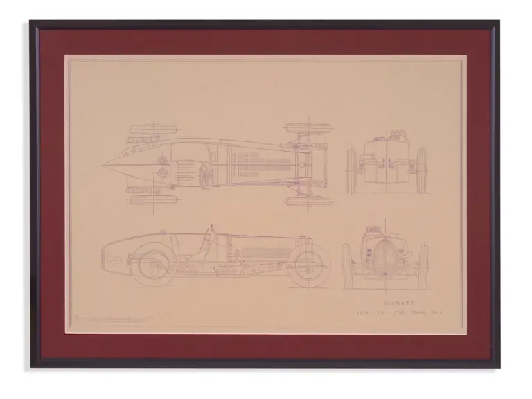 37x28 inches. Lot includes two framed examples of design drawings, one for a 1933 3.3-liter Grand Prix and one for a 1936 Atlantic. Unfortunately, the sun has badly faded the ink on the second print.
