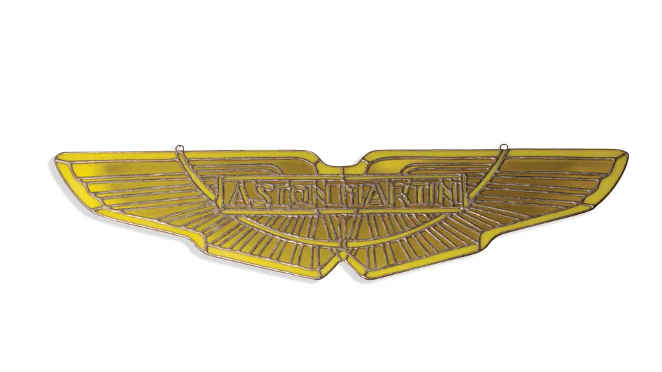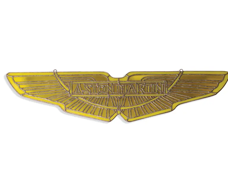 20x9 inches. Lot includes an Aston Martin logo constructed in stained glass and a beautiful custom made Bertone insignia featuring a detailed checkered flag design.